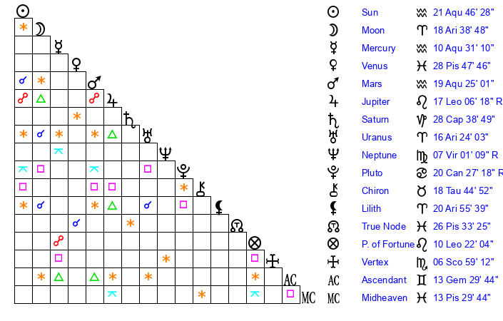 | Saturn | 28 Capricorn 51 | 18 Pisces 33 | 4 Aquarius 58 |