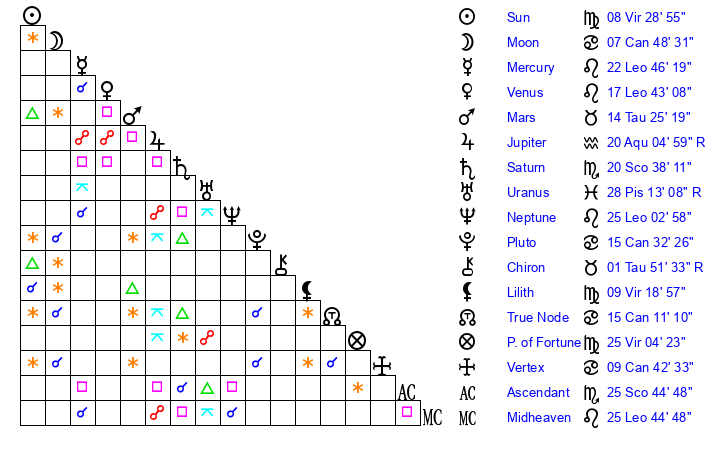 | Moon | 7 Cancer 50 | 25 Sagittarius 29 | 13 Aquarius 4 |