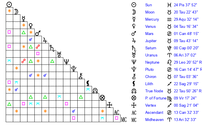 | Sun | 24 Pisces 38 | 25 Pisces 22 | 27 Gemini 54 |