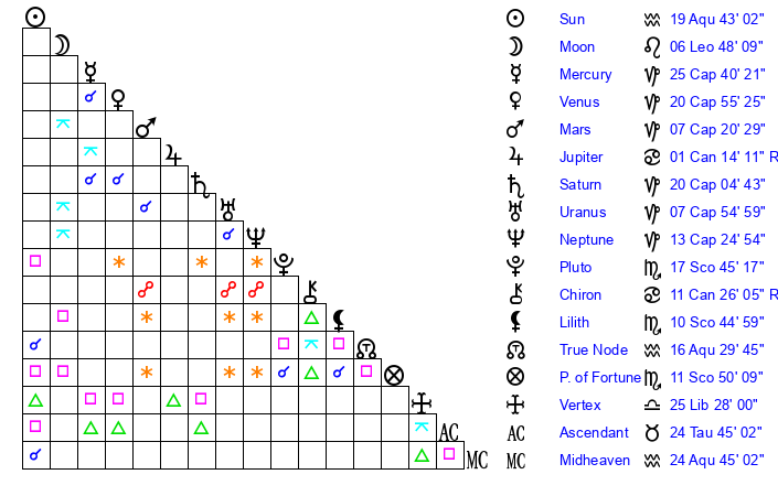 Mercury | 25 Capricorn 40 | 19 Aquarius 40 | 21 Pisces 42 |