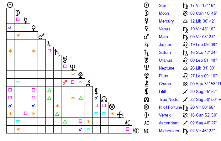 | Venus | 19 Virgo 45 | 19 Leo 16 | 16 Sagittarius 59 |