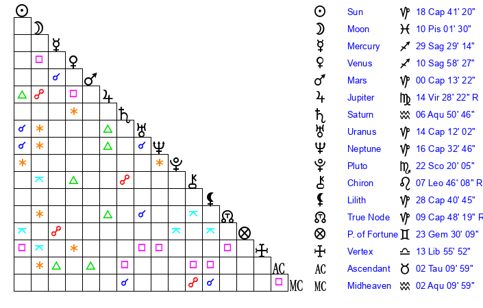 | Neptune | 16 Capricorn 33 | 27 Pisces 26 | 17 Capricorn 44 |
