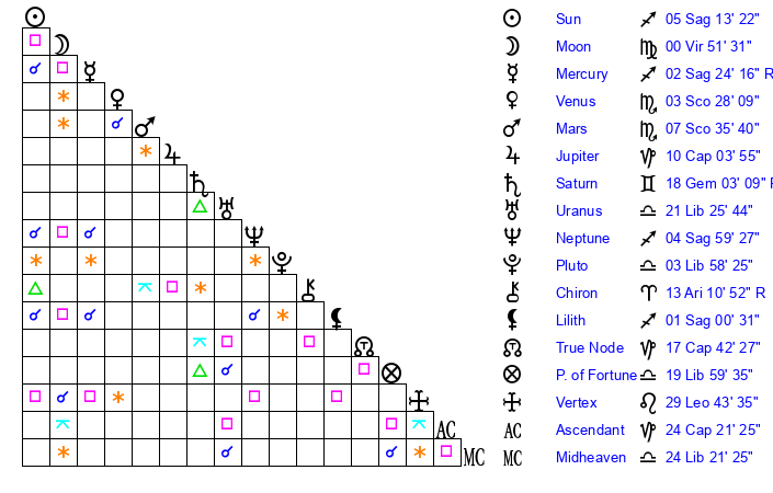| Neptune | 4 Sagittarius 59 | 29 Pisces 24 | 6 Sagittarius 45 |