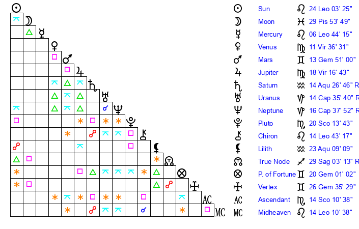 | Saturn | 14 Aquarius 24 | 0 Aries 51 | 12 Aquarius 24 |