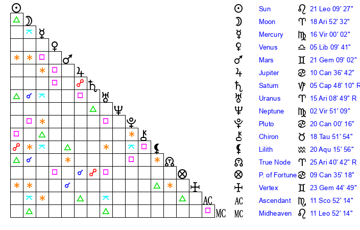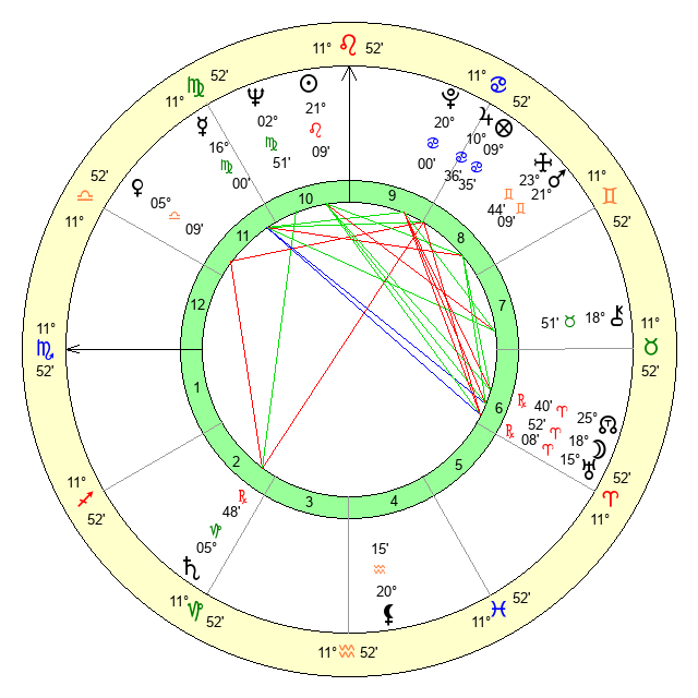 | Neptune | 3 Virgo 24 | 29 Pisces 30 | 1 Virgo 7 |
