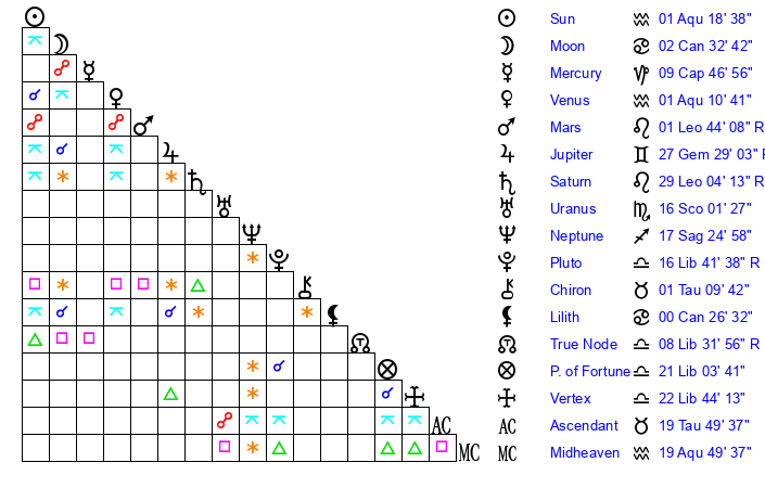 | Sun | 1 Aquarius 18 | 1 Aquarius 54 | 18 Pisces 46 |