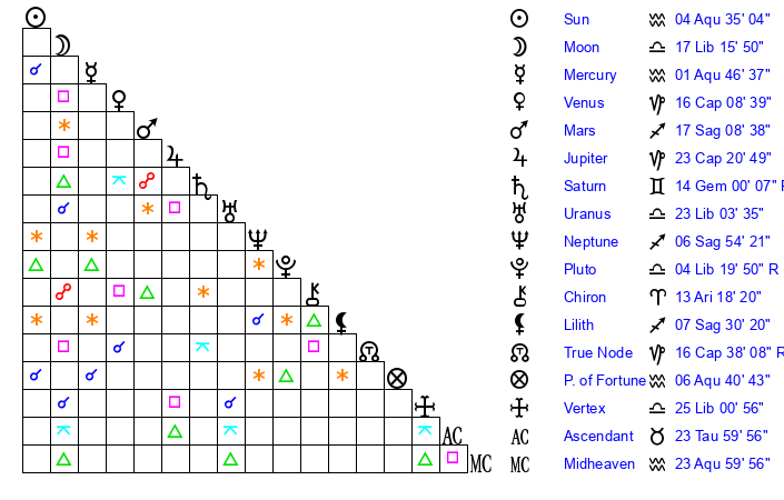 | Pluto | 4 Libra 19 | 1 Aquarius 49 | 3 Libra 13 |