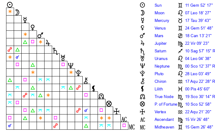 | Mercury | 17 Taurus 39 | 16 Gemini 47 | 13 Virgo 53 |