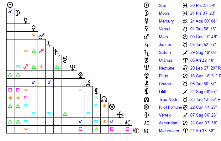 | Sun | 20 Pisces 24 | 21 Pisces 7 | 23 Gemini 50 |