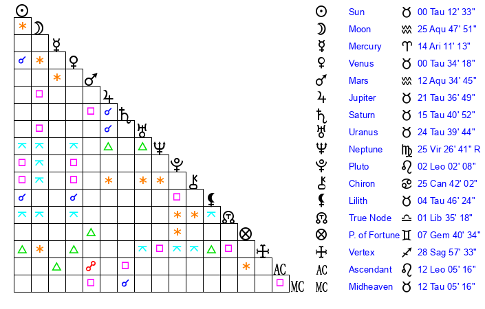 | Saturn | 15 Taurus 52 | 26 Pisces 40 | 25 Taurus 52 |