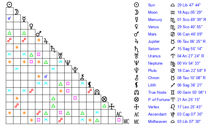 | Moon | 18 Aquarius 2 | 21 Scorpio 29 | 19 Virgo 46 |