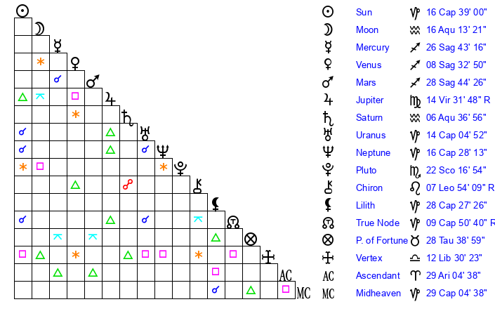| Sun | 16 Capricorn 38 | 17 Capricorn 39 | 20 Aquarius 12 |