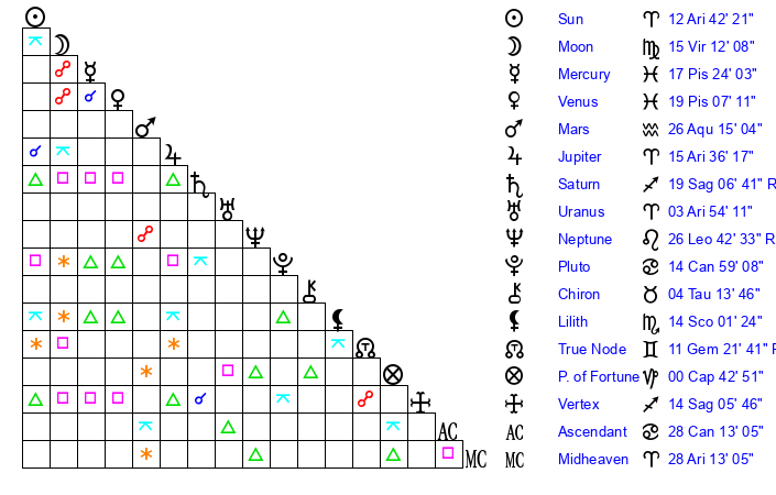 | Moon | 15 Virgo 7 | 12 Gemini 27 | 23 Pisces 5 |