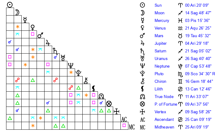 | Moon | 14 Sagittarius 49 | 19 Sagittarius 46 | 12 Taurus 40 |