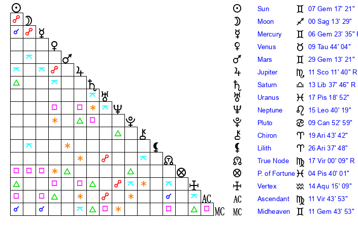 | Sun | 7 Gemini 17 | 8 Gemini 34 | 15 Virgo 0 |