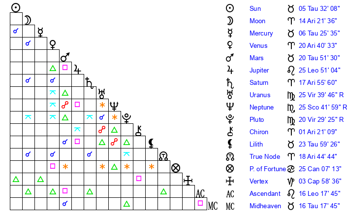 | Sun | 5 Taurus 32 | 5 Taurus 44 | 0 Cancer 21 |