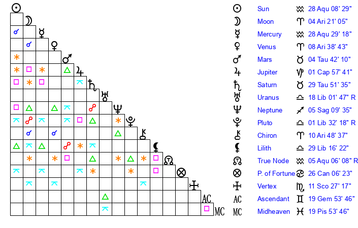 | Sun | 28 Aquarius 8 | 29 Aquarius 17 | 20 Aries 55 |
