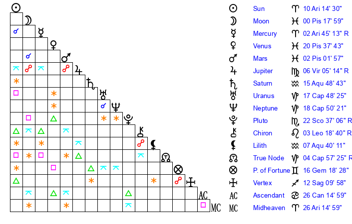 | Mercury | 2 Aries 44 | 29 Pisces 34 | 17 Aries 14 |