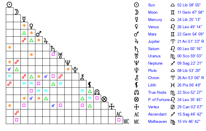 | Moon | 11 Gemini 43 | 27 Scorpio 46 | 16 Aries 45 |