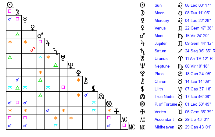 | Saturn | 24 Sagittarius 58 | 1 Aries 35 | 27 Sagittarius 29 |