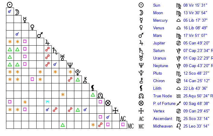 | Mercury | 5 Libra 17 | 26 Leo 30 | 26 Virgo 22 |