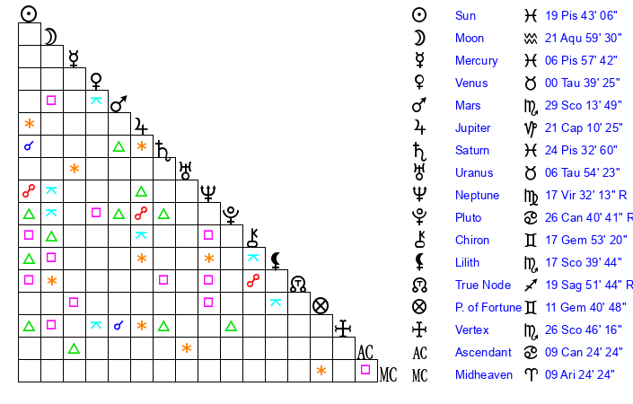 | Sun | 19 Pisces 43 | 20 Pisces 22 | 15 Gemini 32 |