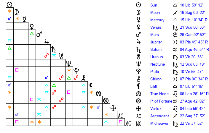 | Pluto | 10 Virgo 56 | 1 Aquarius 22 | 12 Virgo 9 |