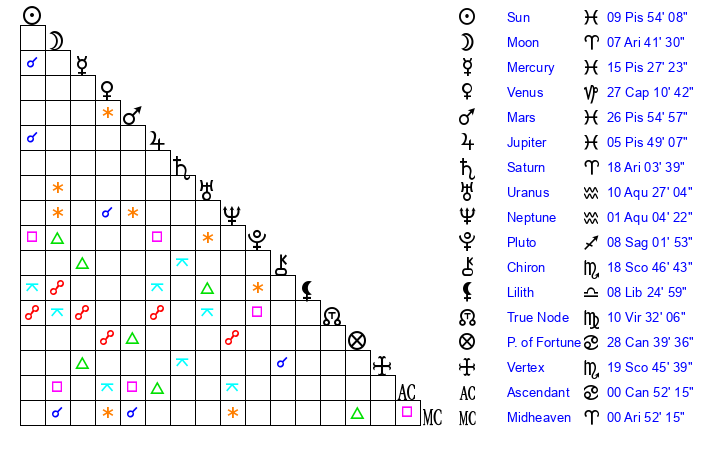 | Sun | 9 Pisces 54 | 10 Pisces 21 | 6 Aries 49 |