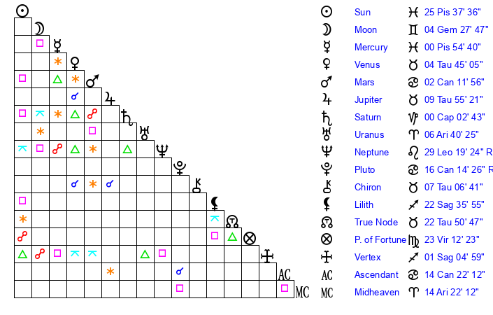 | Pluto | 16 Cancer 15 | 3 Aquarius 16 | 17 Cancer 24 |