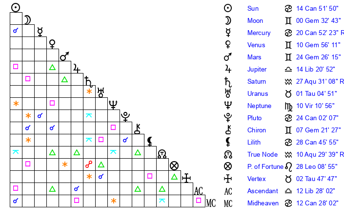 | Moon | 0 Gemini 29 | 9 Sagittarius 30 | 20 Virgo 34 |