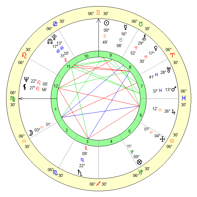 | Sun | 0 Gemini 50 | 1 Gemini 51 | 5 Virgo 35 |