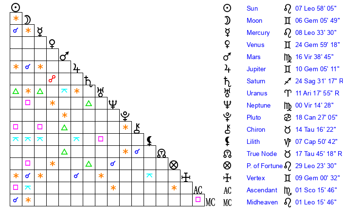 | Sun | 7 Leo 58 | 8 Leo 44 | 11 Scorpio 48 |