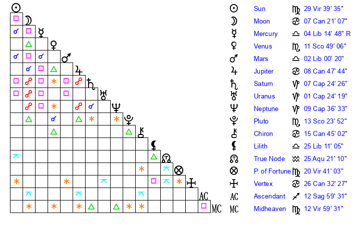 | Moon | 7 Cancer 19 | 9 Libra 47 | 25 Libra 5 |