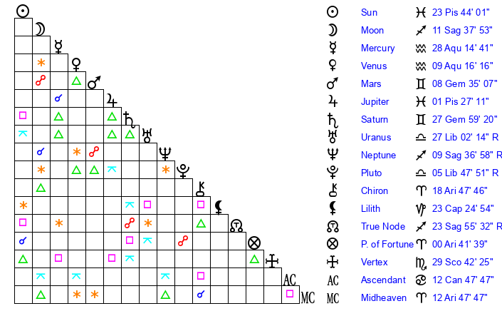 | Sun | 23 Pisces 44 | 24 Pisces 22 | 13 Taurus 50 |