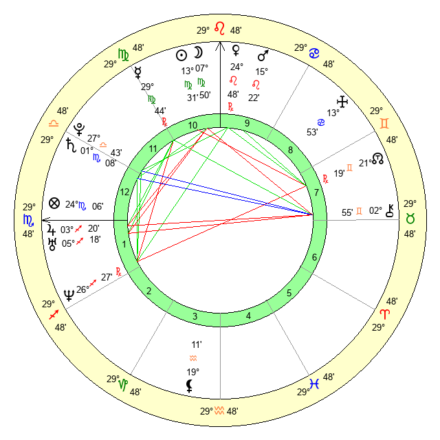 | Moon | 7 Virgo 50 | 0 Pisces 37 | 18 Pisces 11 |