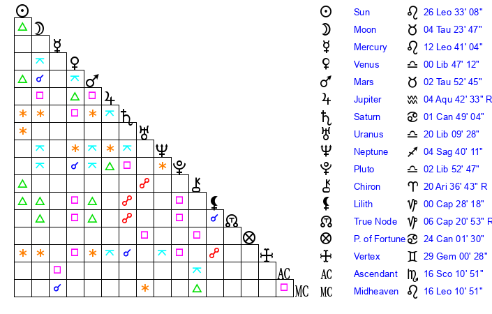 | Mercury | 12 Leo 41 | 8 Leo 24 | 10 Scorpio 32 |
