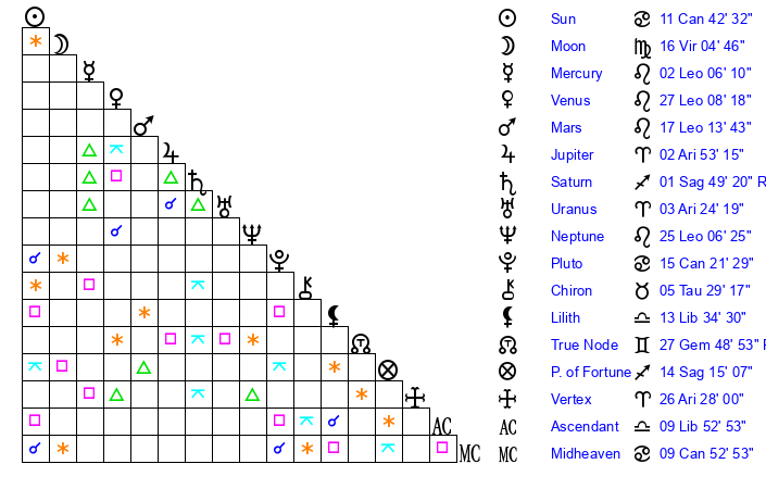 | Moon | 16 Virgo 10 | 3 Scorpio 40 | 13 Aries 44 |