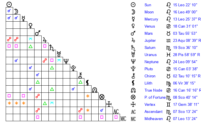 | Mercury | 13 Leo 25 | 4 Leo 37 | 11 Sagittarius 24 |