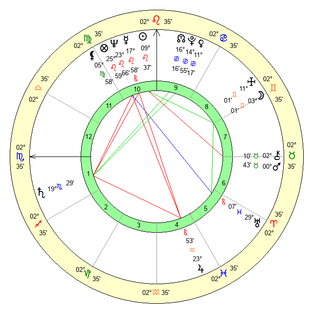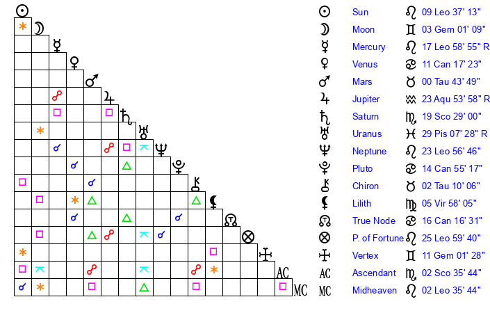 | Mercury | 17 Leo 58 | 7 Leo 45 | 9 Sagittarius 7 |