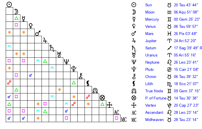 | Sun | 20 Taurus 44 | 21 Taurus 15 | 23 Leo 33 |