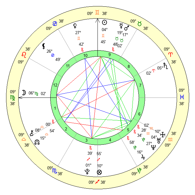 | Moon | 5 Virgo 55 | 14 Taurus 43 | 26 Virgo 29 |