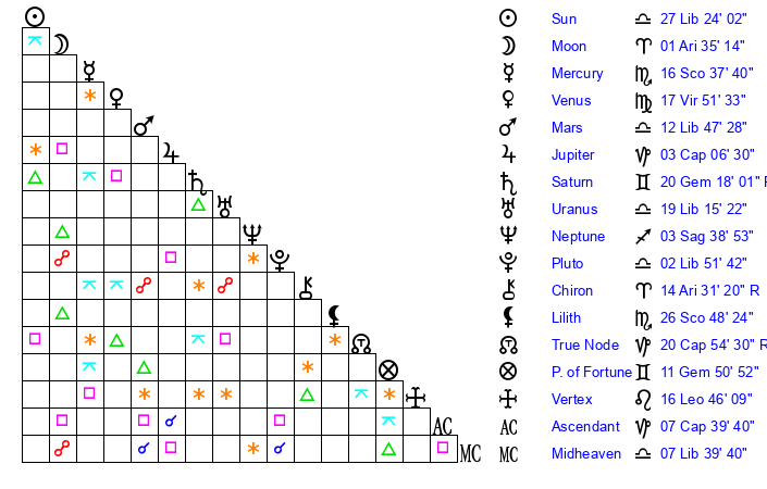 | Neptune | 3 Sagittarius 38 | 0 Aries 1 | 5 Sagittarius 33 |
