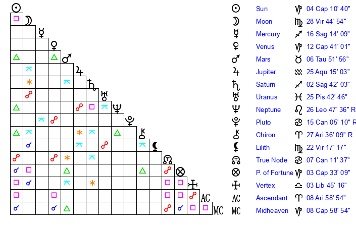 | Moon | 28 Virgo 42 | 21 Pisces 40 | 19 Taurus 27 |