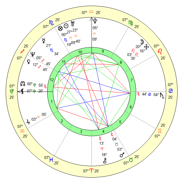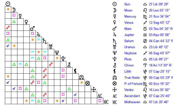 | Moon | 19 Leo 56 | 18 Libra 34 | 12 Cancer 27 |