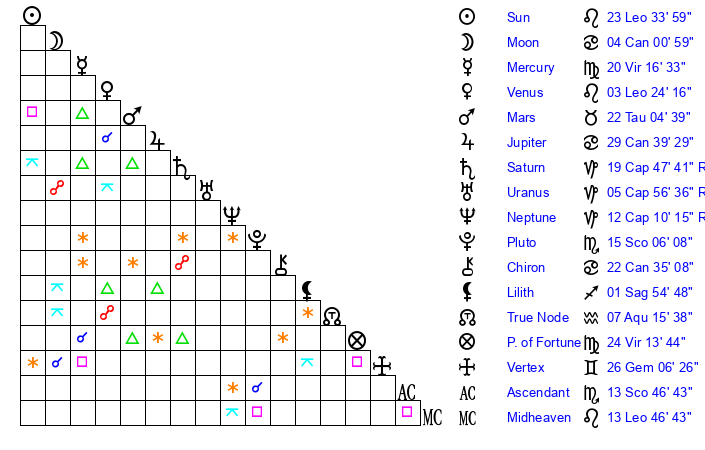 | Venus | 3 Leo 24 | 19 Cancer 20 | 16 Virgo 33 |