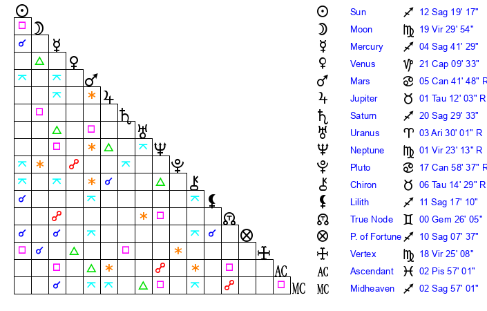 | Sun | 12 Sagittarius 20 | 12 Sagittarius 48 | 20 Pisces 39 |