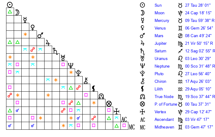 | Mercury | 9 Taurus 59 | 14 Taurus 54 | 23 Leo 16 |
