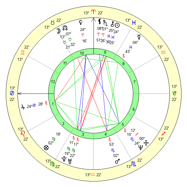 | Moon | 13 Taurus 19 | 10 Libra 51 | 26 Gemini 19 |