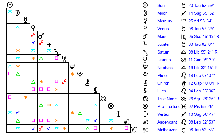 | Sun | 20 Taurus 53 | 21 Taurus 13 | 0 Leo 42 |