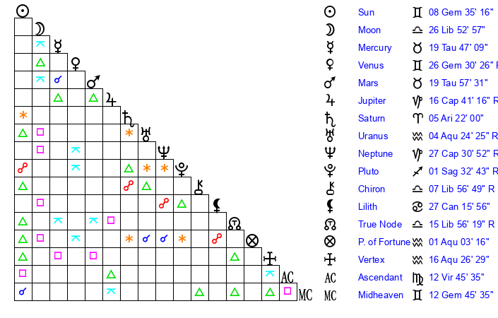 | Venus | 26 Gemini 30 | 22 Aries 45 | 12 Gemini 11 |